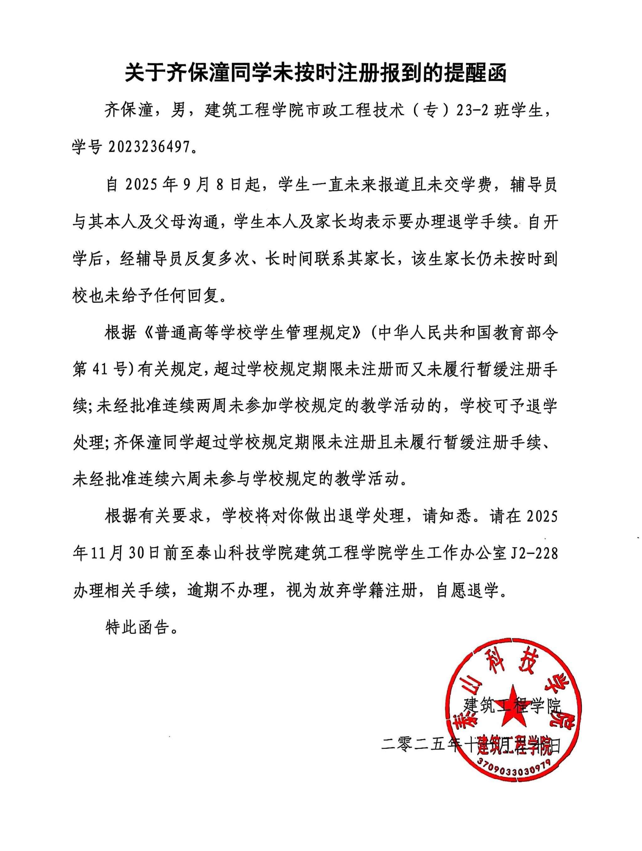 关于齐保潼同学未按时注册报到的提醒函