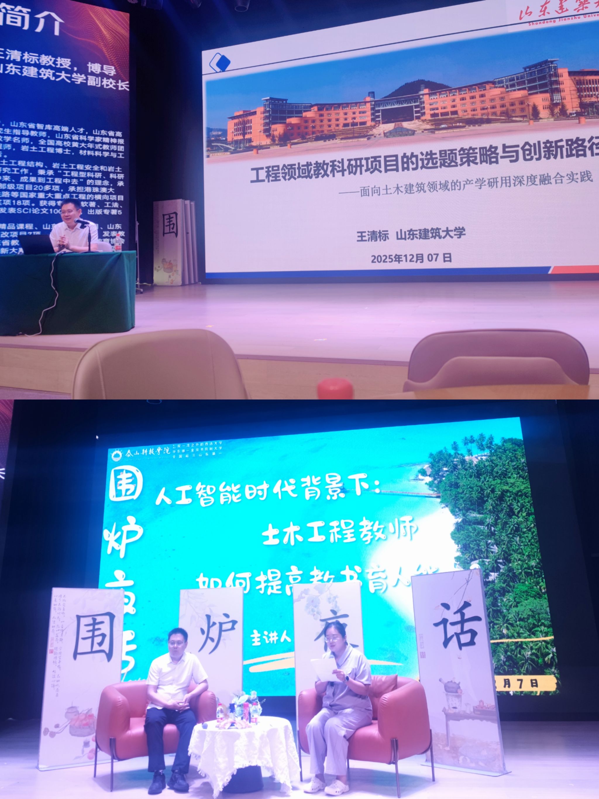 王清标教授聚焦教科研能力提升,带来“工程领域教科研项目的选题策略与创新路径”“教科研成果转化与学术影响力提升”两大专题分享。他立足国家“双碳”“交通强国”等战略需求,系统讲解了教科研选题的“需求导向、学科交叉、工程痛点”三大原则,通过港珠澳大桥、川藏铁路等重大工程案例,演示了如何将工程问题转化为科学问题。在成果转化环节,他详解了国家自然科学基金申报、省部级科技奖谋划的实战技巧,分享了自己团队研发的纤维再生混凝土技术、岩溶隧道灾变预警系统等成果从实验室走向工程现场的转化经验,为教师提供了可借鉴的实践范本。在“人工智能时代土木工程教师教书育人能力提升”围炉夜话中,王教授与教师们深入探讨了AI、数字孪生等技术在教学中的应用,提出“教学相长、与时俱进”的人才培养理念。