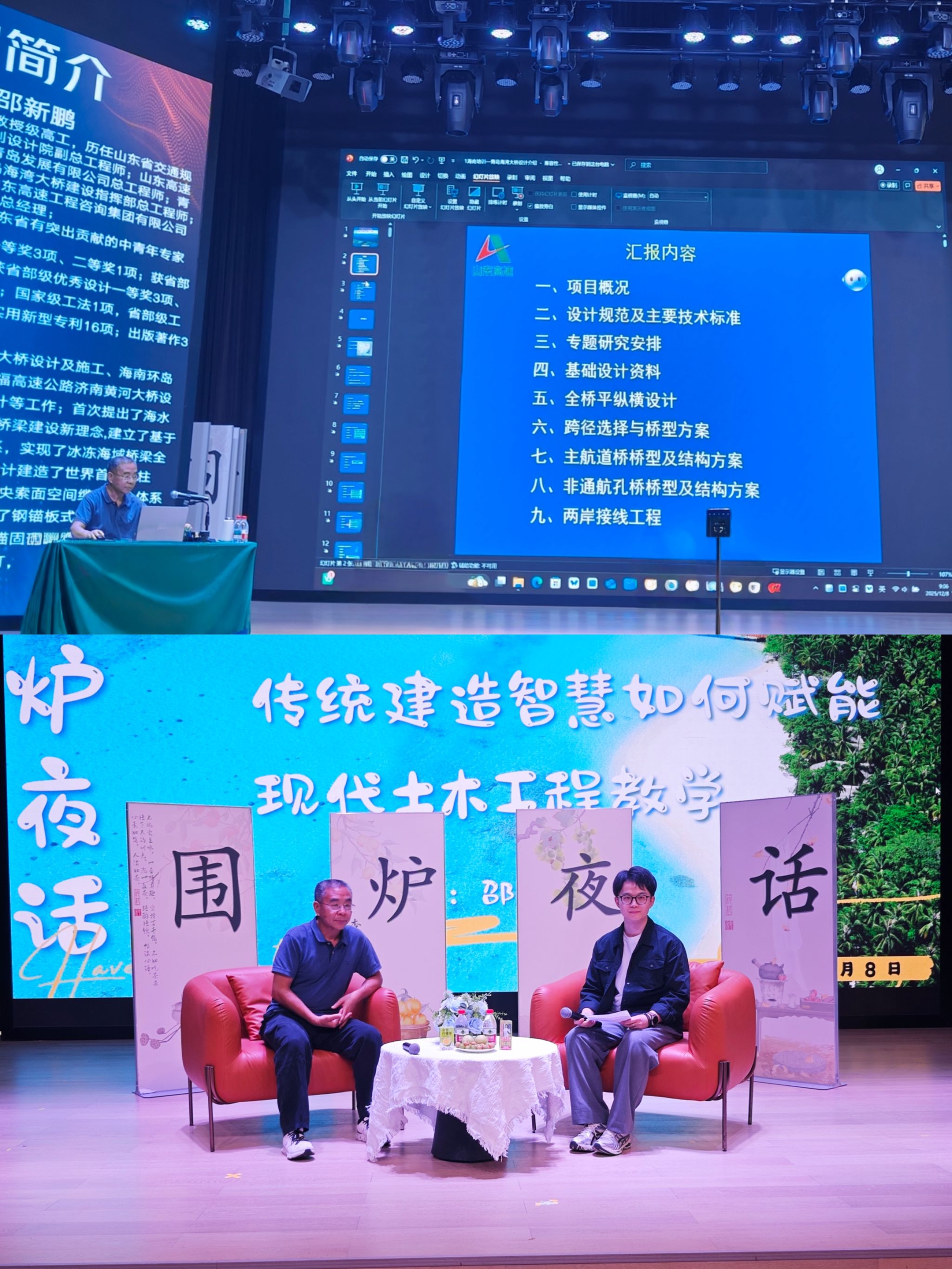 邵新鹏教授则以青岛海湾大桥建设实践为蓝本,带来两场干货满满的专题讲座。在“大型桥梁工程设计施工关键技术解析”中,他深入拆解了世界首座独柱塔分体式钢箱加劲梁悬索桥的结构创新,详解了海水冻融-氯盐侵蚀协同作用下的桥梁防腐技术,以及4D-CAD、GPS定位、视频监控等技术集成的可视化施工管理系统。在“大型基建项目风险管控与科研创新实践”中,他分享了青岛海湾大桥BOT项目管理模式的构建经验,通过项目管理信息系统(PMIS)实现招投标、合同、投资、进度的全流程集成化管理,该系统累计节省工程管理成本3002.5万元,分项工程优良率达98%以上的亮眼成果,让参训教师深受震撼。晚间围炉夜话中,邵教授围绕“传统建造智慧赋能现代土木工程教”,结合赵州桥营造技艺与港珠澳大桥技术创新的对比,引导教师思考如何将传统工艺智慧融入现代课堂。