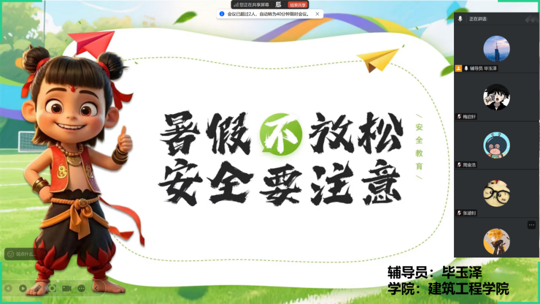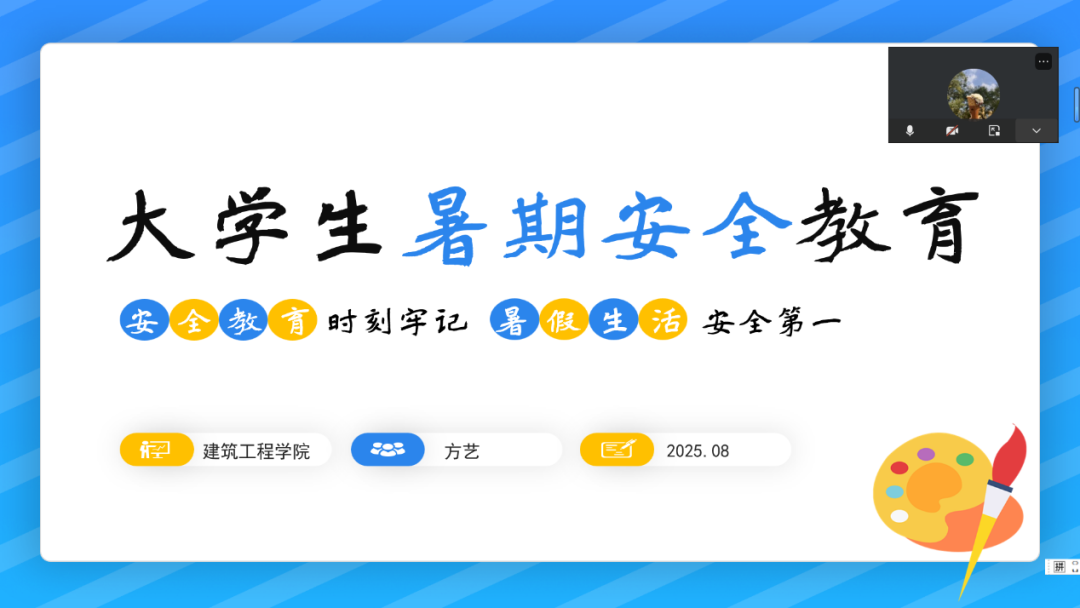 辅导员方艺组织召开了暑期安全教育线上班会。会上,方老师首先带领大家重点回顾了近期频发的典型安全事故案例,随后围绕暑期安全防护的多个关键领域展开了详细讲解,内容涵盖防溺水安全知识的普及、个人信息安全防范要点、日常出行安全注意事项以及心理健康维护技巧等。方老师指出,新学期开启后同学们将获得“应届毕业生”身份,结合就业市场的实际情况剖析了就业形势,鼓励大家积极把握招聘机会,利用各类资源,合理调整就业心态与预期目标。