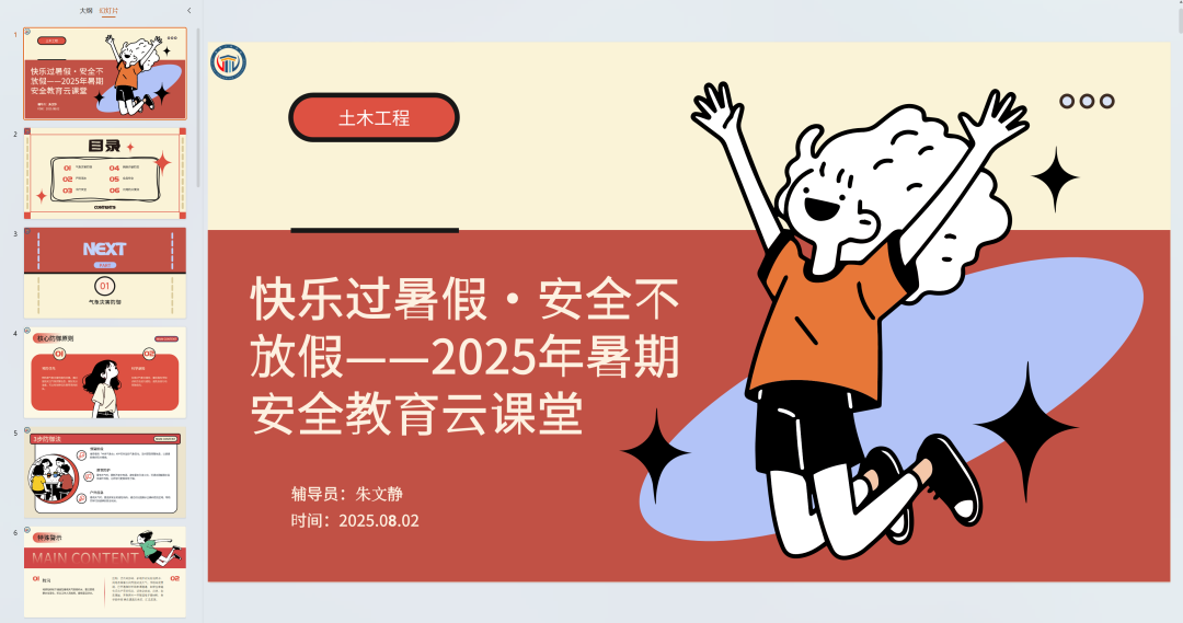 辅导员赵子璇面向2024级建筑工程技术(专)与智能建造技术(专)专业学生,召开了主题为“假期勿松懈 安全伴我行”的线上专题教育会议。此次会议通过腾讯平台开展,聚焦于暑期常见的安全风险,结合实际案例为同学们上了一场内容丰富、警示性强的安全教育课。本次会议聚焦假期高发的风险点,围绕“防汛防灾、防溺水、交通安全、网络防骗、食品安全、旅游风险”这六大板块展开。赵老师以近期校园周边的典型案例为切入点,借助 PPT 图文展示以及播放视频短片的方式,助力学生直观地了解身边存在的安全隐患。在气象灾害防范部分,介绍了汛期应对突发天气的策略,着重强调“非必要不前往山地、水边、临崖区域”。针对溺水问题,通过“警示一刻钟”环节讲述了大学生溺水事件,强调“不私自下水、不擅自施救”的原则。特别针对暑期兼职与实习诈骗现象进行讲解,还原诈骗话术,并指导学生下载使用国家反诈中心 APP。最后,提醒学生合理规划假期,注重心理健康调适,倡导健康的假期生活方式。