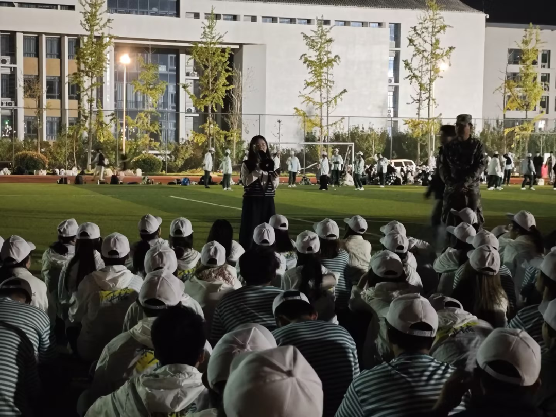 辅导员方艺则在新生军训期间,于操场组织班会,结合高校安全案例,重点强调消防安全、交通安全等内容,通过真实电动车违规充电案例让学生重视安全问题。
