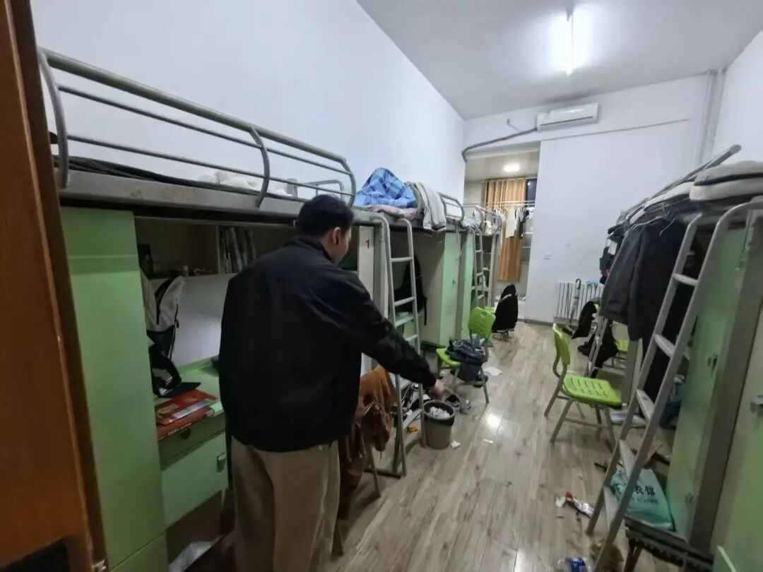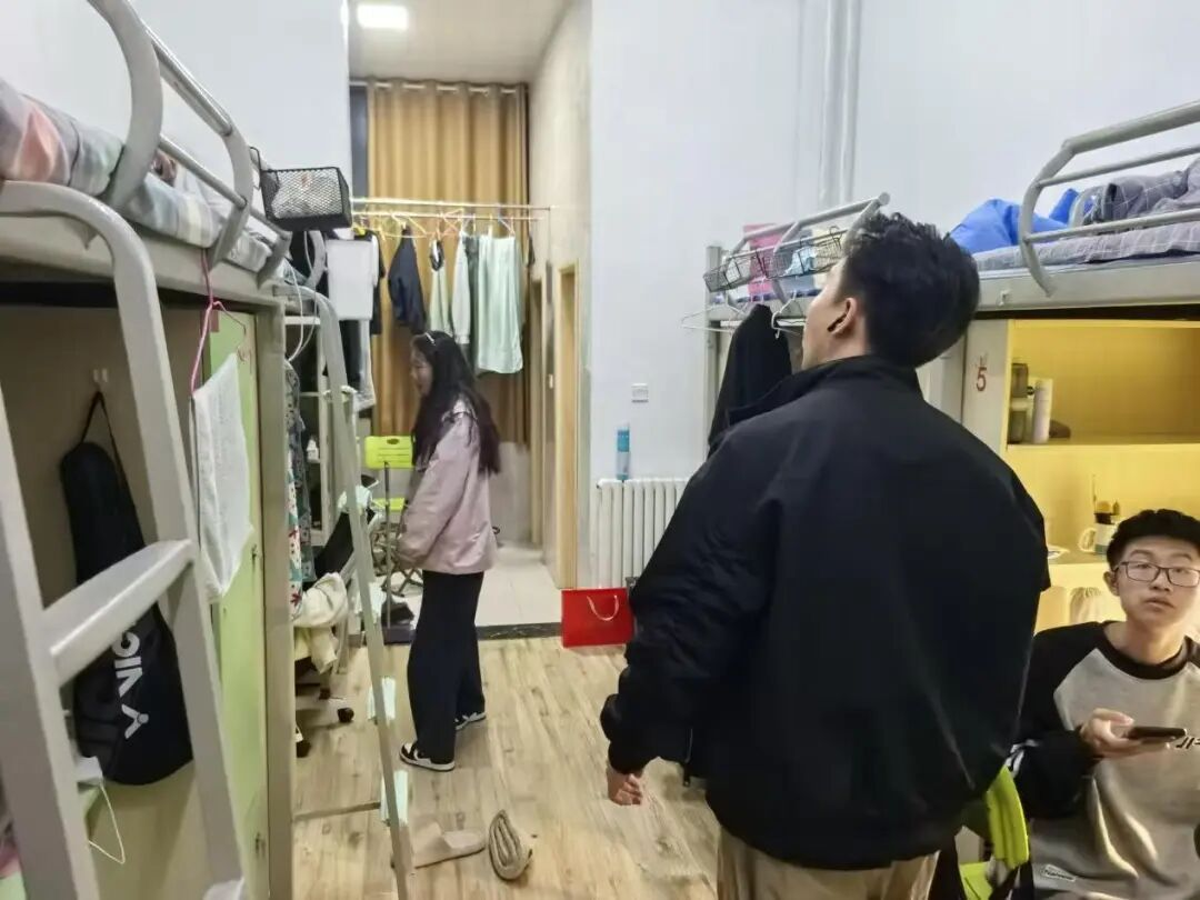 刘增静老师走访汶阳书院2023级男生宿舍,检查宿舍时,重点查看卫生、安全用电及门窗设施。整体情况良好,多数宿舍整洁,物品摆放有序,无违规大功率电器;对卫生较差宿舍,刘老师现场提整改意见并开展安全教育。此次检查排除隐患,强化学生安全意识与集体归属感,也体现学生良好的自理能力。