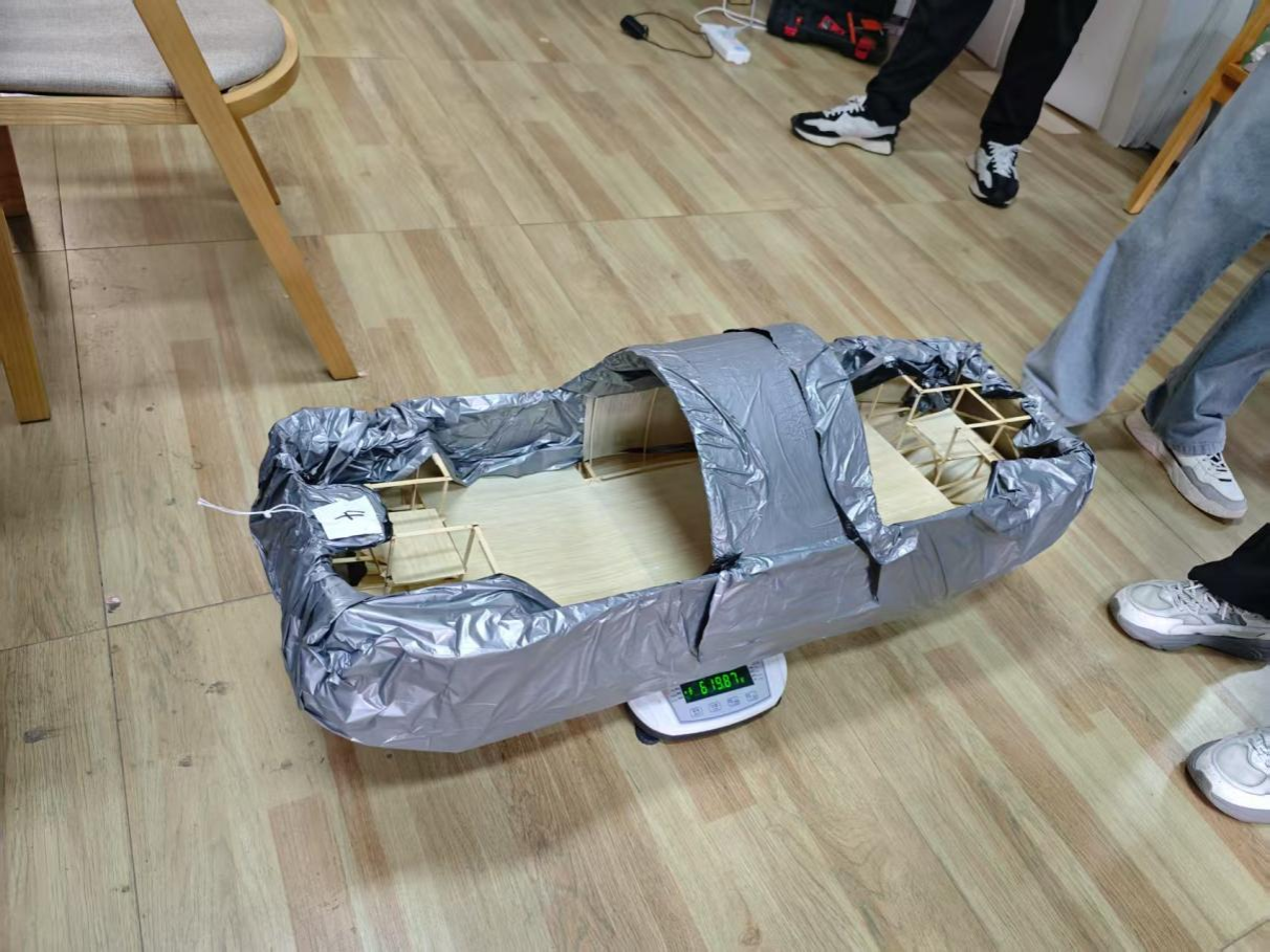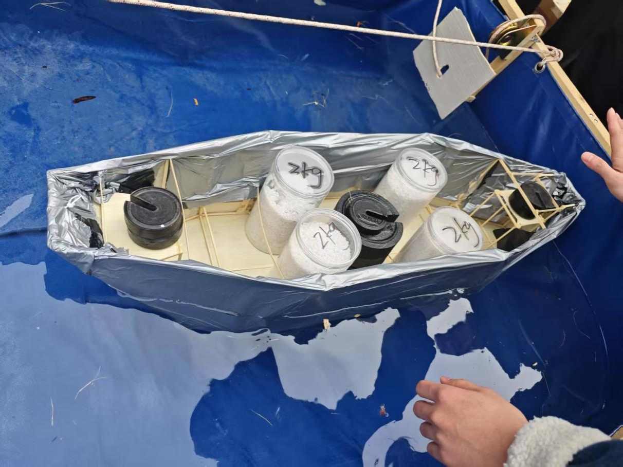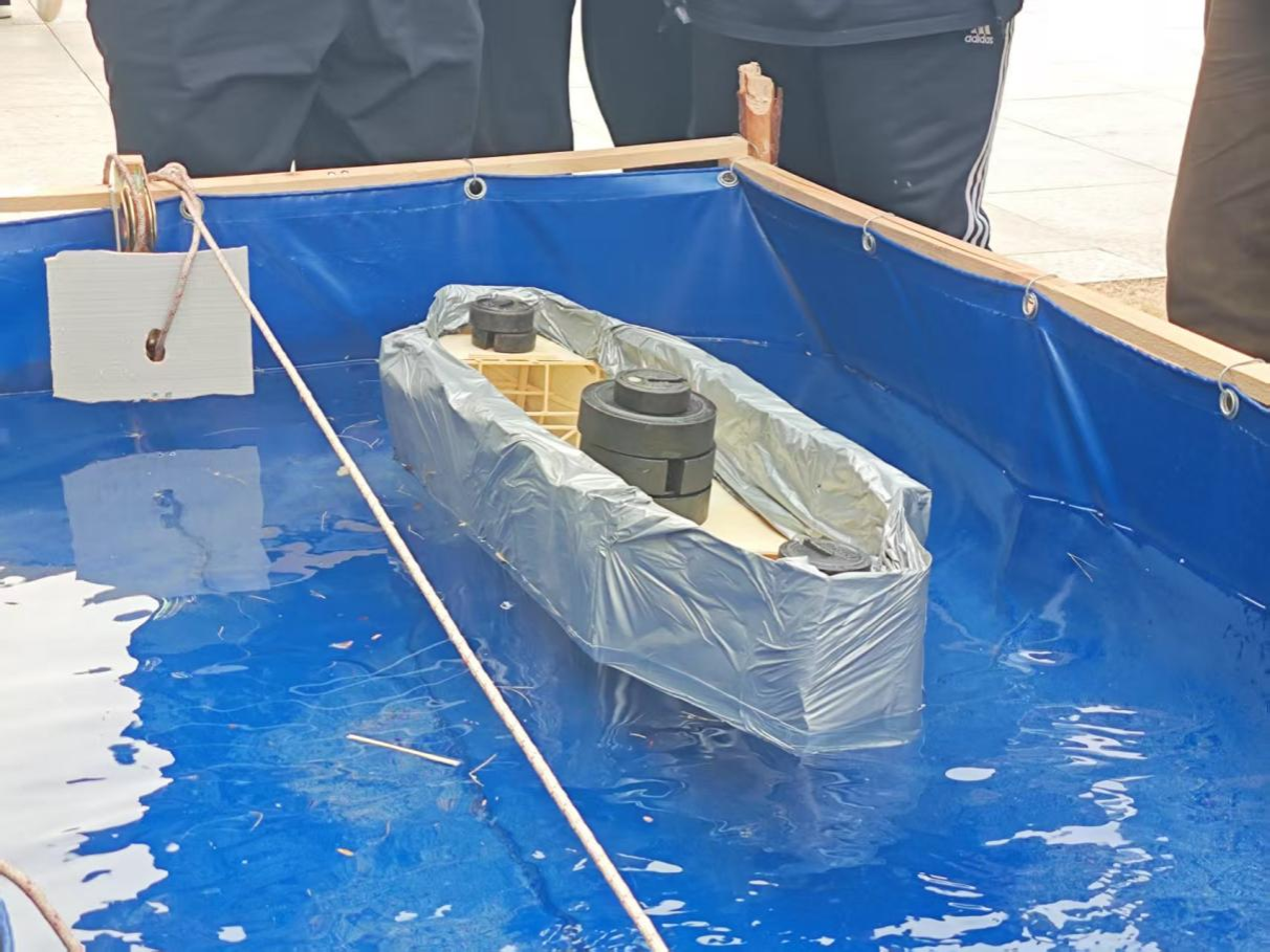 本次制作的乌篷船船体结构需满足严苛的规避区净空要求,船篷防水膜铺设与抗变形能力更成为得分关键。在三级加载环节,模型需承载最高达10kg的砝码,并通过造浪装置模拟的水道完成往返航行。选手们巧妙运用滑轮牵引系统,结合砝码动态调整,展现了扎实的专业素养与临场应变能力。