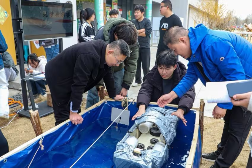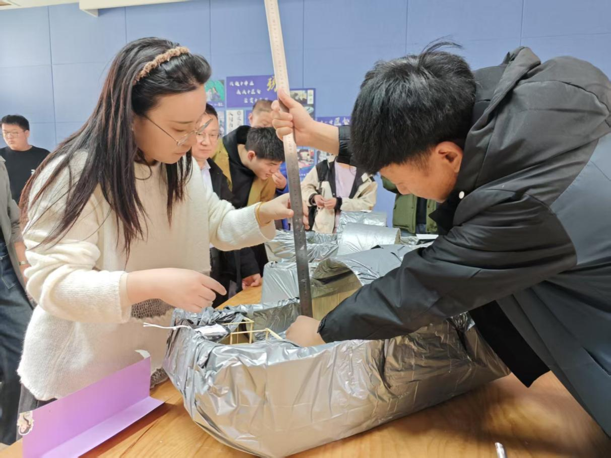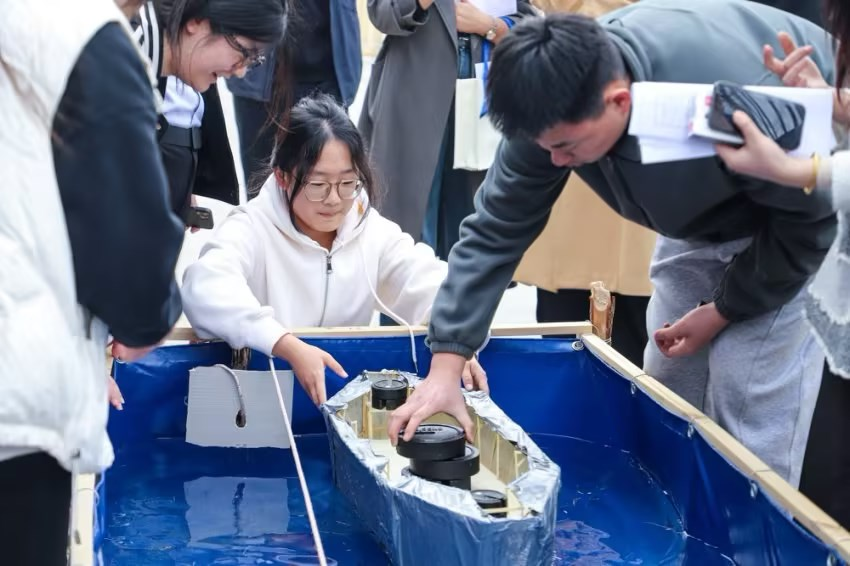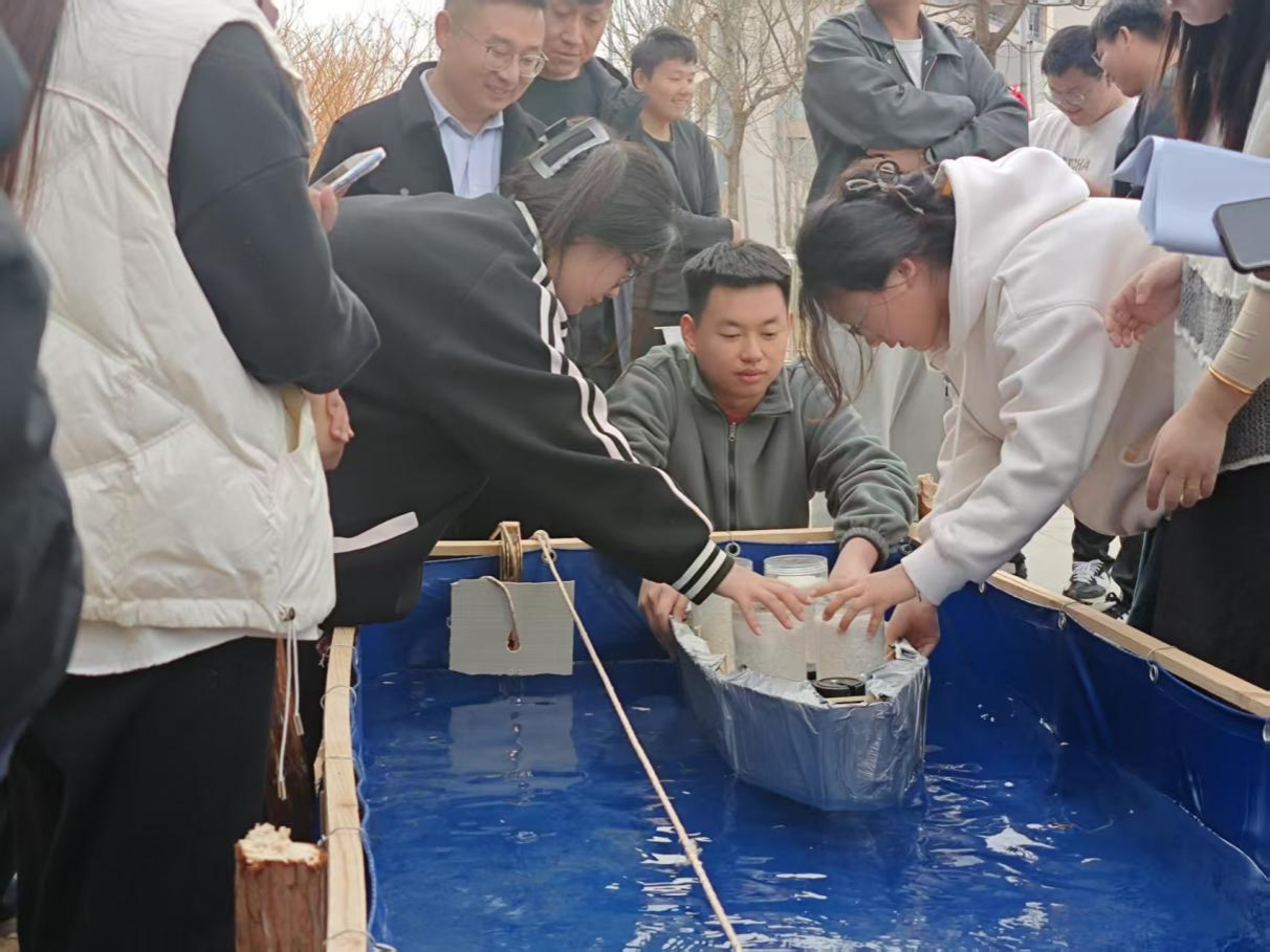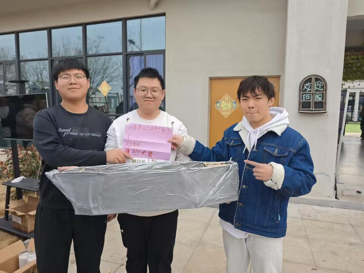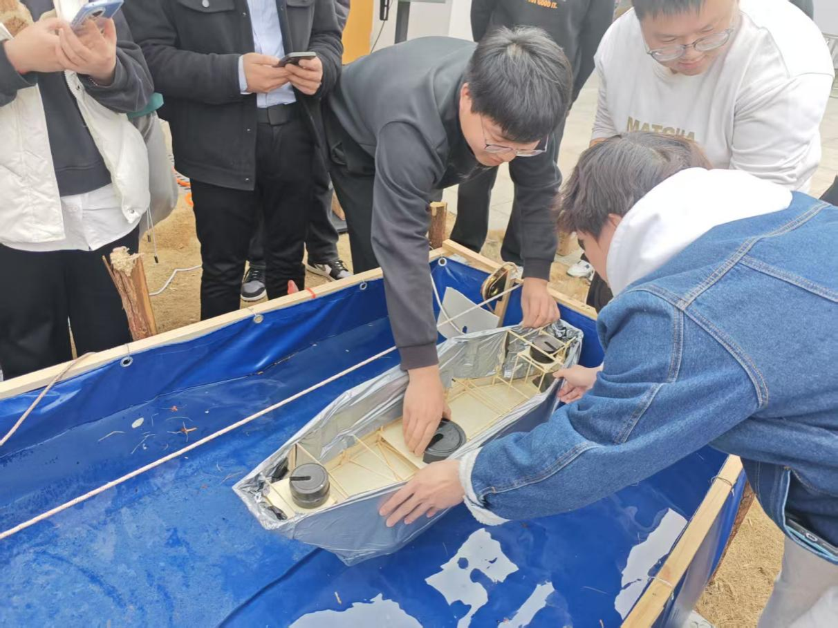 加载测试环节高潮迭起,评委从模型质量、载重能力、航行时间及防水性能等多维度综合评分。最终,闪基英格兰逗意志舰队(徐瑞乾、邱轩烨、姜道宽)凭借轻量化船体设计、高效抗撞击结构及稳定的航行表现脱颖而出,斩获一等奖。郑和舰队(马金彪、王福林、邢广迎)、规划可能队(王浚珲、邵现鑫、段信全)获得二等奖,上岸队(范广康、颜海港、马钰涛)、长城守望队(刘岩松、刘香红、魏新宇)、海底小纵队(唐圻、高雨婷、赵佳艺)获得三等奖。获奖队伍队长姜道宽在感言中表示:“设计乌篷船不仅是技术的挑战,更是对传统文化的致敬。我们希望通过我们的双手设计创新,为传统技艺注入青春活力!”