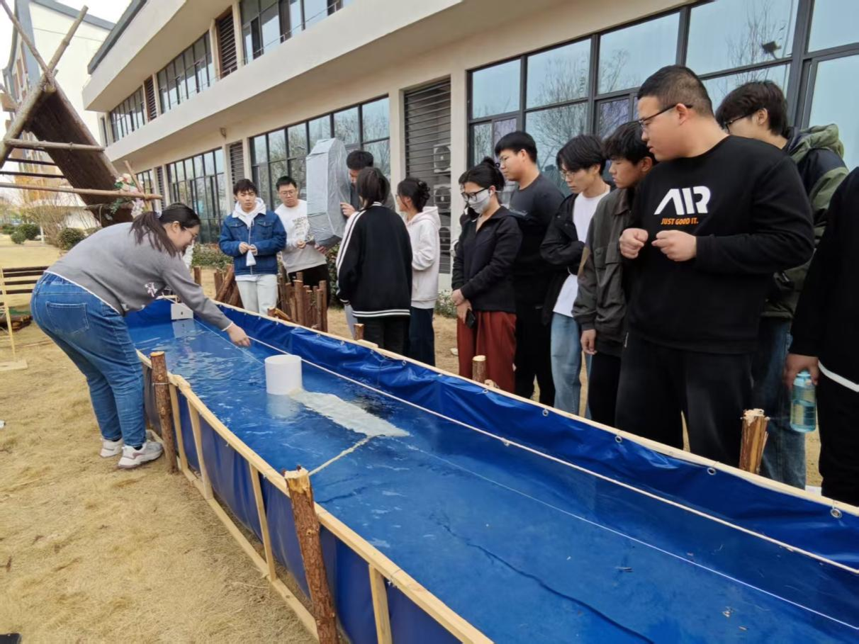 为了比赛当天各参赛队伍更好的从理论设计、模型制作到加载测试全程投入,提前3天,在比赛地就搭起了6米长的水池,以篷布做底,木质框架支撑打桩,经过反复测量、试验、注水最终临时固定在室外草坪。