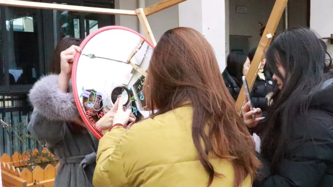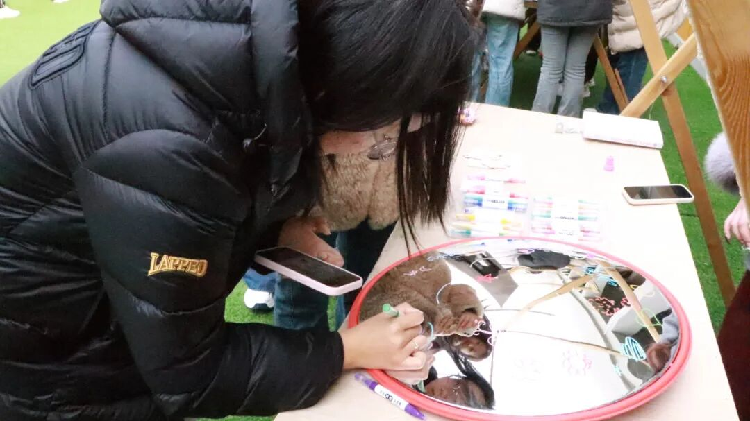紧接着是手工DIY化妆镜,大家用粘土打底,用珍珠和其他装饰品进行点缀,制作出独一无二的化妆镜,寓意着每个女生都有独一无二的美丽。转头就是哈哈镜+夸夸板的组合吸引着大家走过路过,都没错过。哈哈镜前,不约而同地拿起画笔作画,一笔笔抽象的图案呈现后,女生们也笑哈哈的举起手机打卡拍照。“小姐姐,能不能辛苦你把镜子举高点,再侧一下,我也想加入”。一系列“咔嚓”后,参与者也拉上了工作人员一起打卡夸夸板,虽然大家身份不同,但girls help girls的体验真的很不错。
