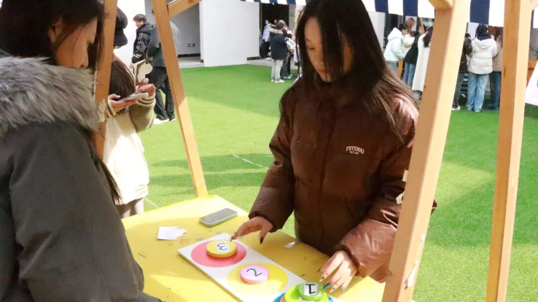 除了幸福感爆棚的瞬间,也有紧张但不刺激的挑战等待各位。挑战一让大家“晕头转向”。参与者需要捏住鼻子大象转15圈,径直走进桌前,将乒乓球弹走的同时保持水瓶盖子不掉落。这项挑战除了考验平衡感,还十分考验耐心程度,在接二连三挑战失败后,听到“算了,这太难了,我们走吧,大不了不要徽章了”。或许是看出了她的焦虑,现场的小哥哥耐心上前开始了沟通。“同学,你要不要先试试下一个项目,好像时间和挑战次数限制,你先试试其他项目呗”!挑战二“数字九宫格”让大家逐渐尝到成功的味道,随着手机摇一摇出现数字,将沙包投掷到地面的九宫格中,两次机会使沙包投到数字之和等于手机随机出的数字,没有技巧,都是满满的Lucky!挑战三是经典的“汉诺塔”,参与者需要将圆盘从一根柱子移动到另一根柱子上,且每次只能移动一个圆盘,较大的圆盘不能放在较小的圆盘上,听起来流程繁琐,但动起来就变身逻辑强者。所以你们看,挑战有不可能,但总有机会看到可能,同伴的互助,陌生人的安抚,自己再向前一小步,越过半边山也趟过半边海。