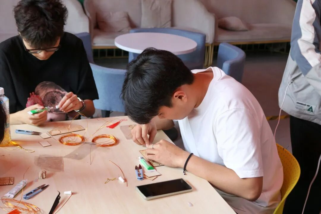 活动开始,同学们看着桌上整齐摆放着制作掐丝珐琅所需的各类材料,从色彩斑斓的釉料、细长的金属丝,到精致的木质画板等,一应俱全,为同学们开启非遗创作之旅做好了充分准备。拿起镊子,小心翼翼地将铜丝沿着设计好的图案轮廓进行弯折、粘贴,每一个动作都透着专注和认真。