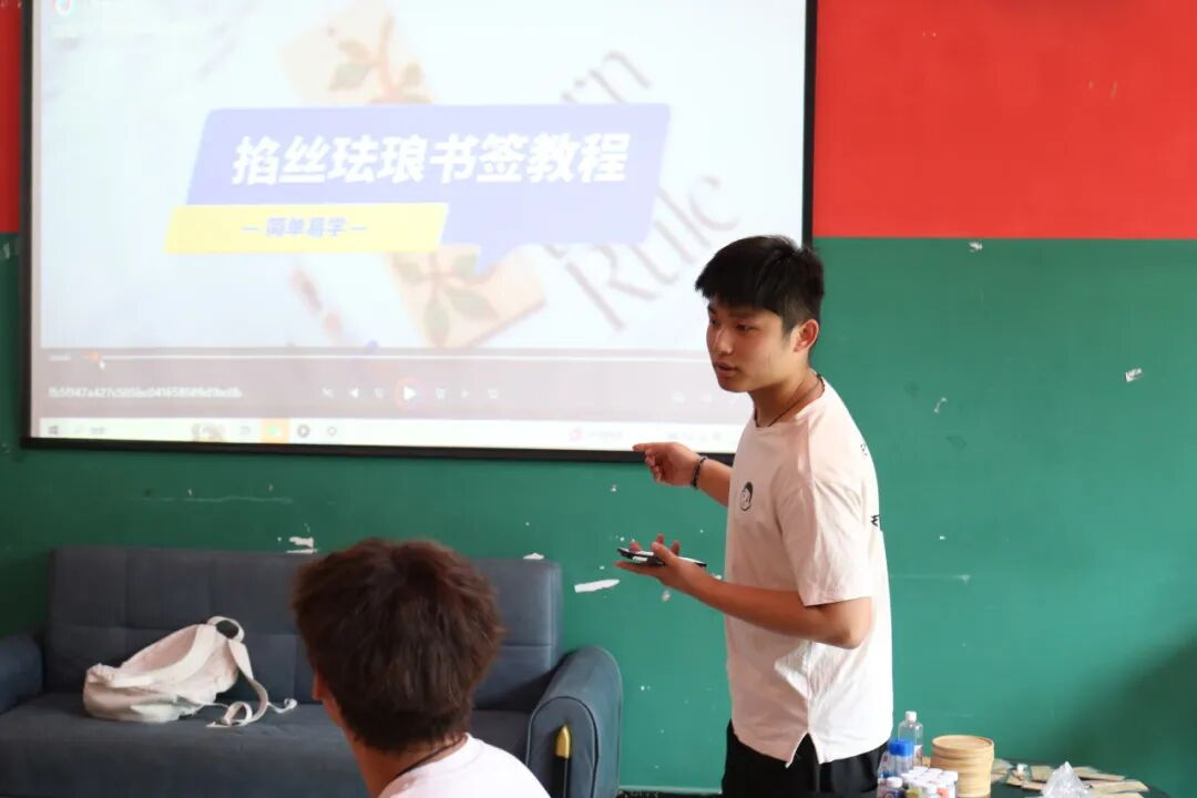 随着同学们陆续进场,工作人员为同学们分发工具,同学们挑选自己喜欢的款式。等到同学们落座后,负责讲解的同学为大家播放了珐琅这一非遗文化的视频,让大家都认识到了什么是珐琅,同学们看到精美的艺术品后,纷纷跃跃欲试,摩拳擦掌。紧接着播放了如何制作掐丝珐琅。并且讲解了今天的活动的目的及内容。