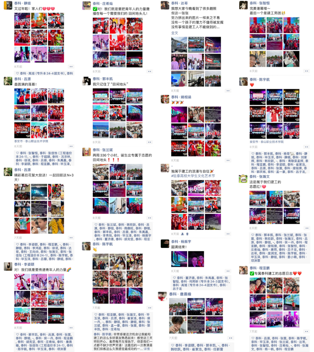 内容:“老师,我们的演出画板好像丢了”距离演出开始还有1小时,在泰山职业技术学院的候场室里,一句话语引起了不小的骚动,所有演职人员心头一紧。“所有演职人员,尽快核对自己负责的所有物资,没有问题的在群里回复”,这是来自青协部长郭浩瑞的第一句话,在仔细的检查过后,成员因为连续三天的大巴奔波,确定了有三件参演道具没有抵达现场,有些失落和自责的情绪已经出现在演员脸上了。“我去协调泰职的学生会,看看能不能帮上忙”,“我打电话给在校学生,让他们送过来”,在老师们感觉大家的情绪濒临极限的时候,我们耳边传来的是几位二年级学生说出来的解决方案。“没关系,咱们演出一定能顺利完成。”、“没事儿,别放心上,我们想办法解决”,这一句句话,给了当时的老师团队很大的震惊,这一个个学生在如此压力之下,爆发出来的是对团队的奉献、帮助和鼓励,其实在那一刻,本场晚会的演出已经圆满结束了。是学生们的自信、担当一路托举,让我们得以顺利演出完毕,谢谢参演的所有台前幕后的“红马甲”们,谢谢你们!