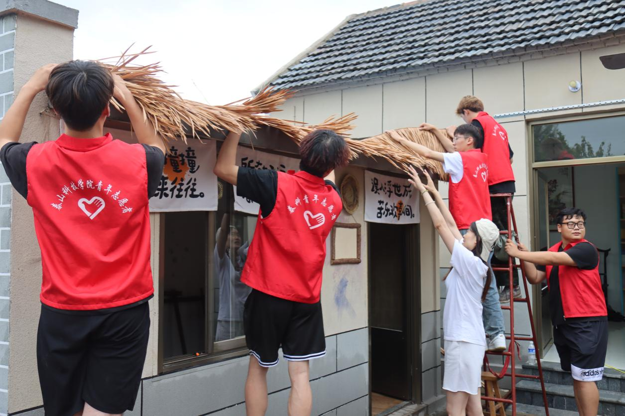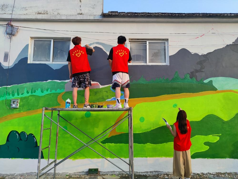 直到23年夏天,那句“村里缺个能看书的地方。”让我们有了用建筑专业做志愿的机会,村支书主动邀请我们将闲置的书画院改造成“泉乡书屋”。带着这份信任与期待,我们决心在三下乡期间把书屋建好。接连不断的暴雨、昼夜不停地施工,让我们没有辜负村民与支书的期待,在168小时内顺利建成“泉乡书屋”,吸引了邻村村民与游客的慕名前来。如今,这里不仅是书屋,更成了文旅打卡点。墙绘前游客拍照、农产品被争相购买、汉服体验让年轻人流连忘返。3000多人次到访,村集体增收1万元。书架上的每一本书,墙绘的每一笔色彩,都是我们为村庄注入的青春活力。