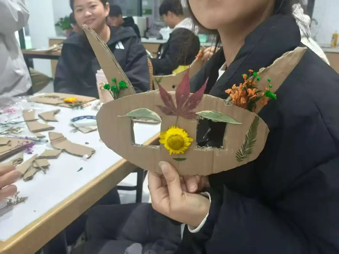 活动现场的长桌上摆放着制作面具所需要的材料,有风干后依然保持绿意的叶片、颜色依旧鲜艳的橙红的花朵,还有彰显自然气息的深褐的枯枝,每一份材料都带着阳光与泥土的印记。工作人员提前为同学们准备了空白的纸板,剪刀、双面胶等工具,并在屏幕上播放着创意案例——各式的面具样式映入眼帘,为初次尝试的同学提供灵感。