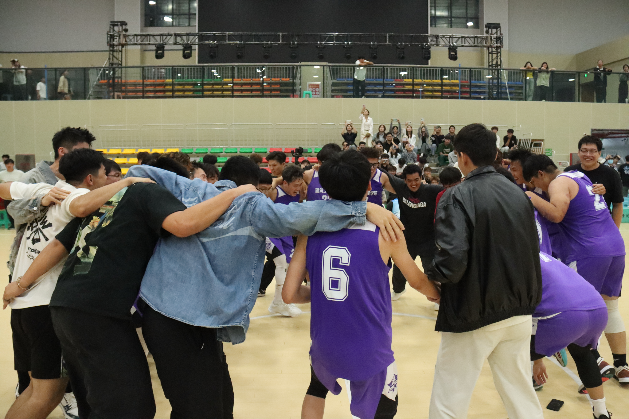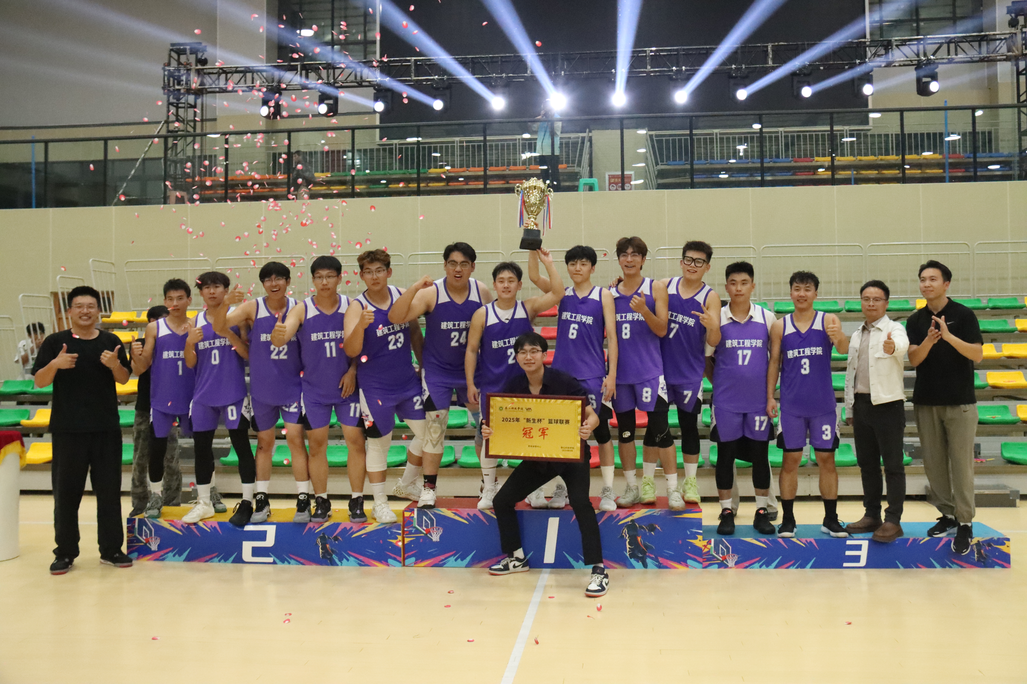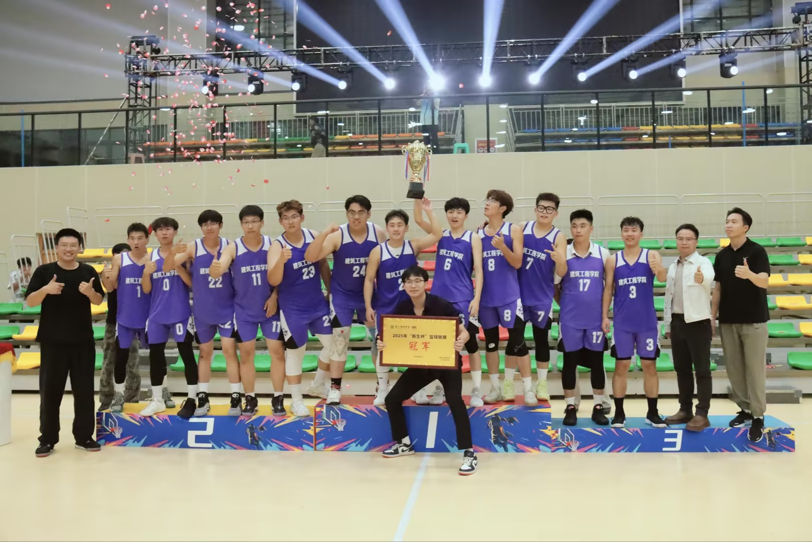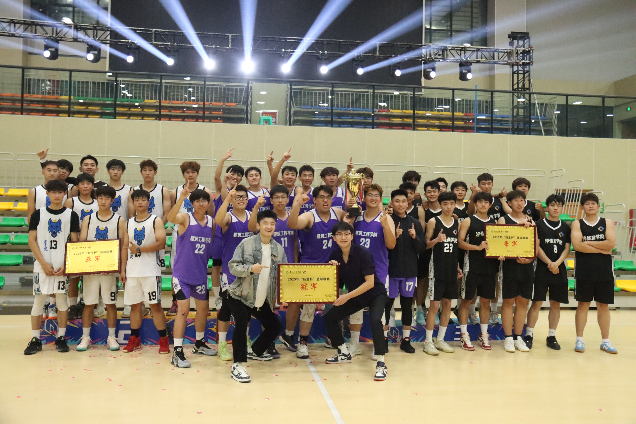 当最后一个投篮结束,全场的欢呼声瞬间冲破场馆屋顶,仿佛是一场青春的暴风雨席卷而来。建工男篮相拥在舞台中央,彩带从头顶倾泻而下。那些泪光中,有拼搏的艰辛,有坚持的执着,更有胜利的喜悦。从小组赛的初露锋芒,再到最终站上决赛赛场,这条征途上的每一滴汗水都未曾白流。那些曾被质疑的时刻、咬牙坚持的瞬间,此刻都化作了通往决赛的勋章,让所有的付出、坚守与协作都有了答案,它的名字叫“团队”。