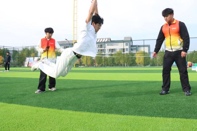赛道之上,每一帧都是青春的剪影。50米障碍赛中,建工的同学们灵活跨越栏架、轻盈挥动跳绳,专注的眼眸里盛着向前的坚定,场边此起彼伏的呐喊与欢呼,如潮声般为逐梦的脚步伴奏;摸石过河项目里,大家踩着道具“石块”稳步挪行,每一步挪行都藏着平衡的智慧,每一次稳稳驻足,都是对自我的突破,是少年不服输的倔强;跳远接力环节,助跑时的风掀起衣角,起跳的瞬间定格成诗,将少年意气凝成最鲜活的风景,将活力洒下赛场每一处。